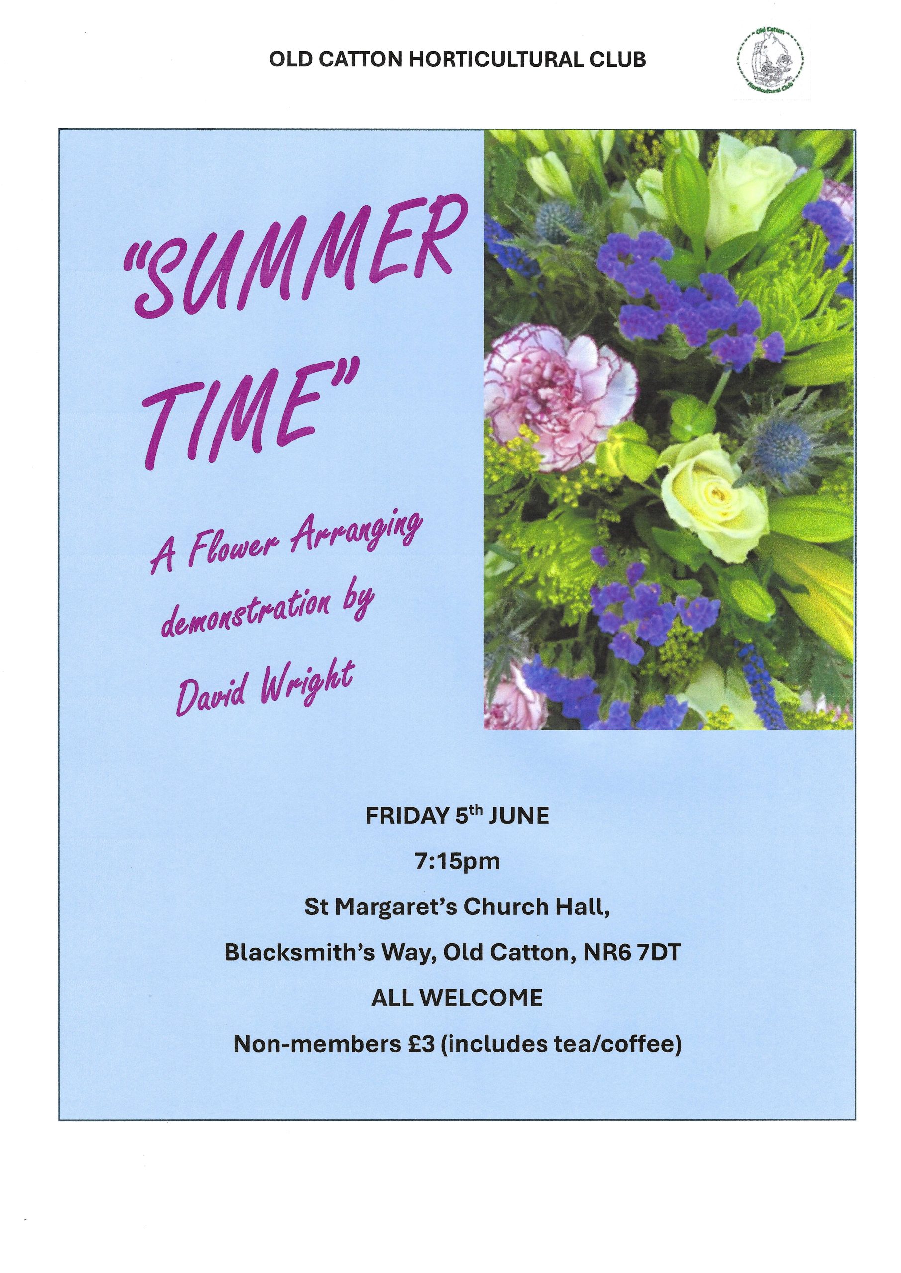 David Wright from Larch Cottage Florist will be giving a flower arranging demonstration, making 4 arrangements which will be the raffle prizes at the end of the evening. All welcome!